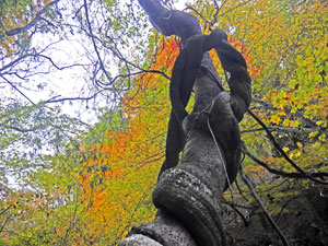 色づいた森に大蛇のような蔓植物。取りつかれた木も災難だ。 |