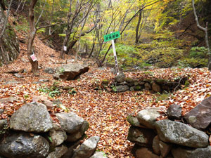標高860m辺りまで下って「炭焼釜跡」横を通過。この辺りまで下るとコースが穏やかになってきた。 |