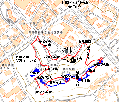 8時54分「がにやら池」先は「忠生公園大橋」下に園地が広がって見えたが、駐車場方向へ折り返す。 |