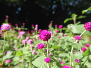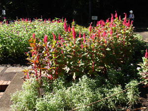「ケイトウ」が満開状態。森へ進むと前方下にソフトボール場が見えた。森の中を南へ回り込みながら進む。 |
